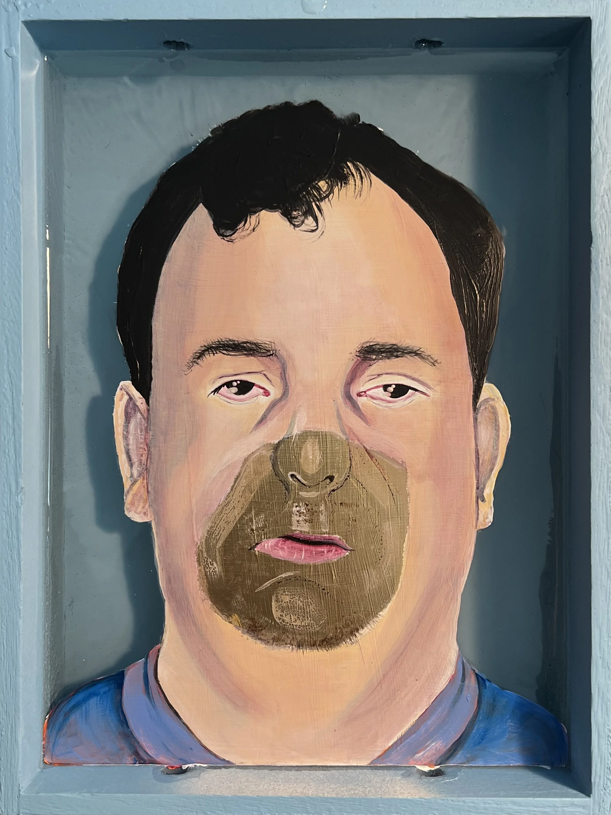 acrylic paint, FlexSeal, ink, graphite, and wood in epoxy resin