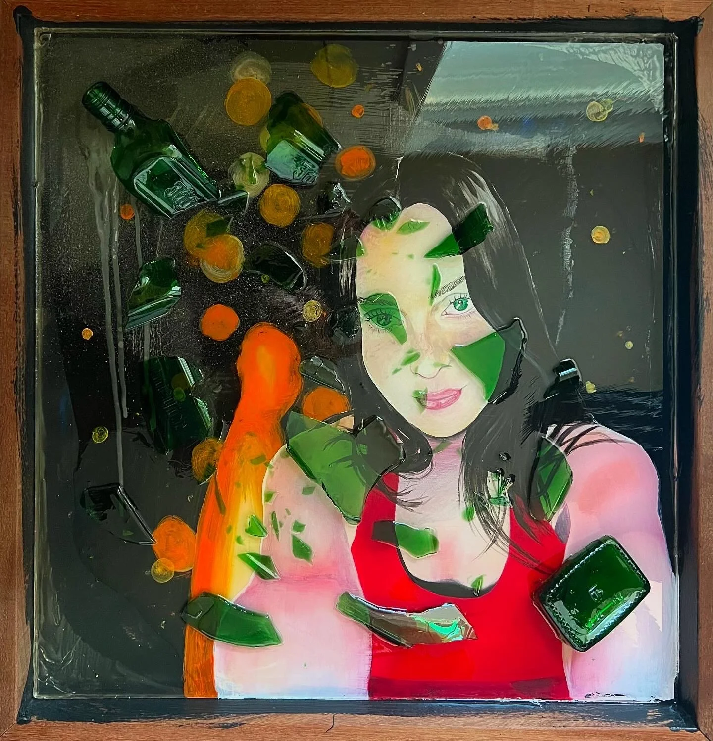 acrylic paint, spray paint, chalk ink, epoxy resin and Jaegermeister bottle on reclaimed wood